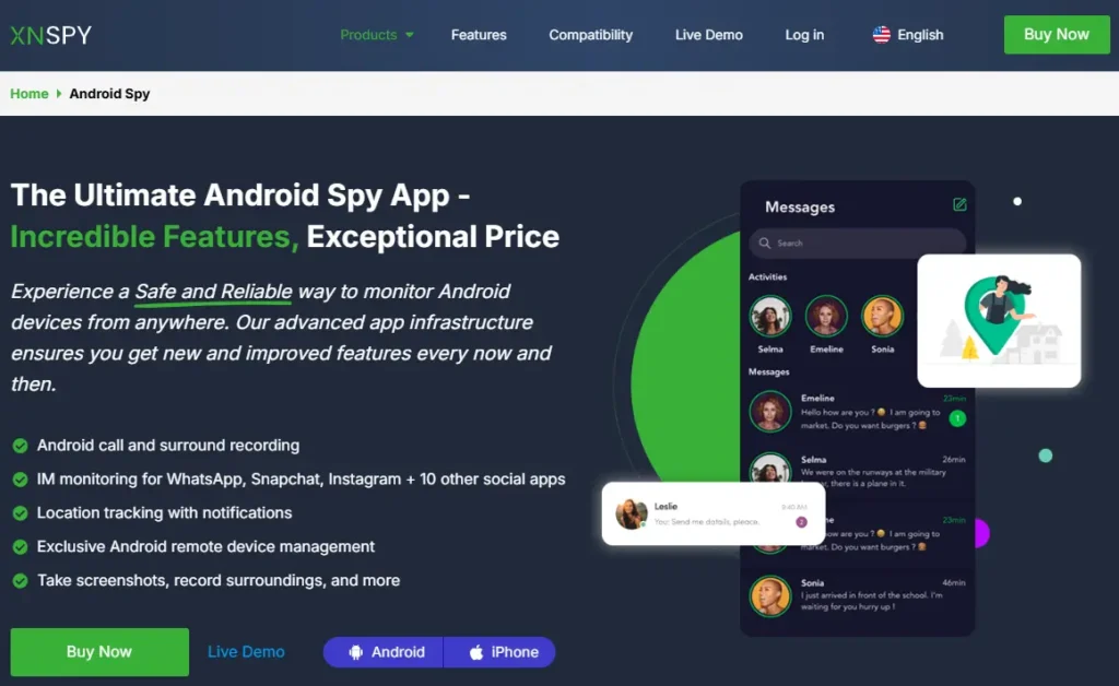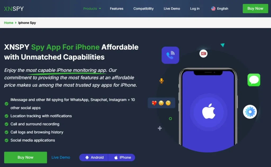 Xnspy is compatible with iPhones as well. It’s good at tracking deleted data, particularly if used in conjunction with iCloud syncing. It’s a good choice if you’re looking for tDeleted text restoration, tApp monitoring, tGPS logs, and tSocial media interaction.