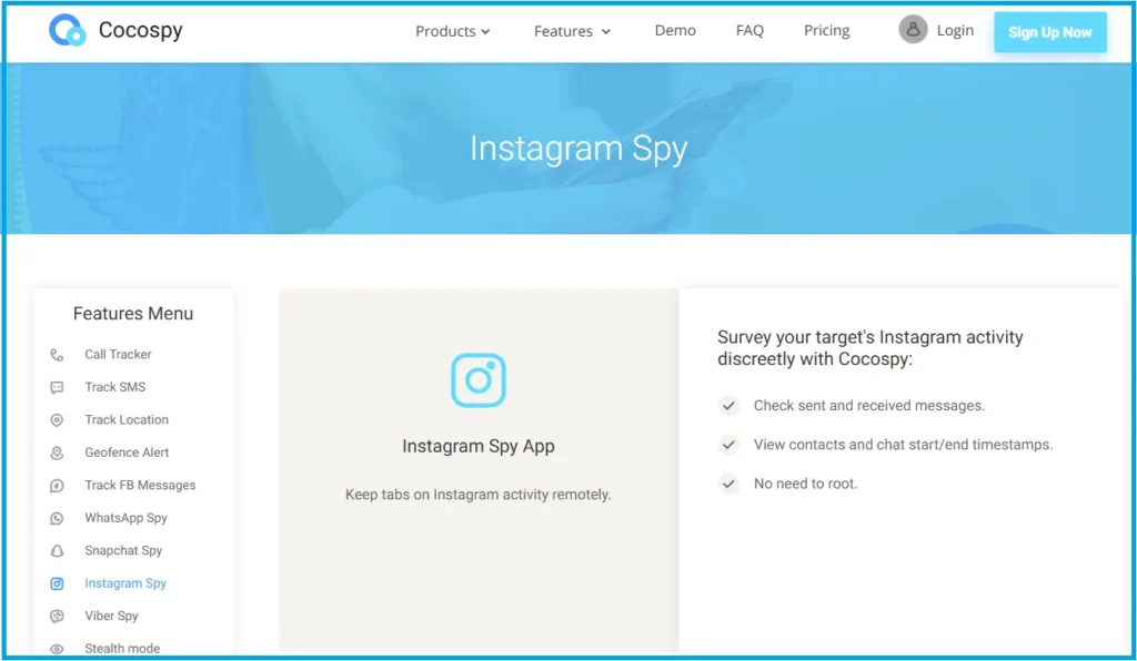 Cocospy is considered a trusted mobile monitoring service that gives a reliable way to keep an eye on Instagram activities. Instagram data such as photos, videos and messages that are private, can be accessed directly from a web dashboard on any PC. Cocospy can be used on Android without having to root or jailbreak, while many other services depend on these steps.