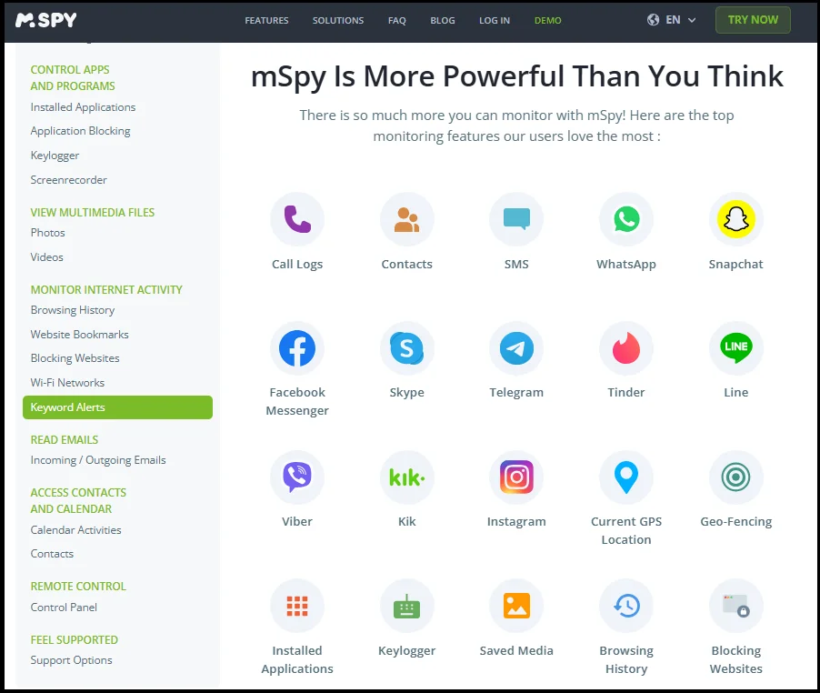 The highlight of mSpy review is the social media monitoring skills. mSpy can get into messages and shared media on WhatsApp, deleted messages and group chats included. The app will surveillance Facebook Messenger chats, Instagram direct messages, and vanishing Snapchat content among others and save screenshots, text messages, voice records, and image attachments to your dashboard. Even such apps as Telegram, Viber, Skype, Tinder, Line, and Kik are under its radar. Last but not least, the keyword alert option within mSpy allows parents to track the use of particular words, e.g., words associated with cyberbullying, dangerous activity, or strangers, and be notified in real-time whenever they are used in a chat.