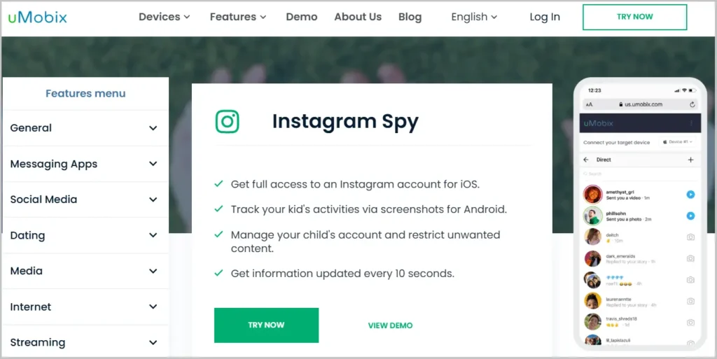 mSpy is a reliable parental control and monitoring tool. It doesn’t show the follow list directly but lets you track Instagram usage, DMs, and interactions which helps you figure out who was recently followed.