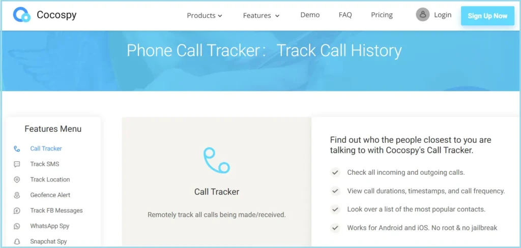 Cocospy is suitable for people who want to use a simple tool that provides recent information on their calls. When you don’t need to root or jailbreak the phone, Cocospy can show you all recent calls with names, numbers, timings and how long each call was. It also watches for updates to the contact list and keeps track of the most dialed numbers.